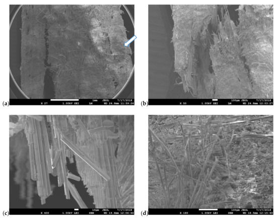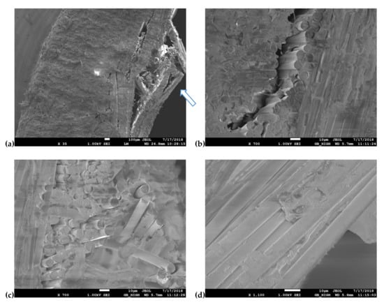 Fracture Surfaces (across the thickness direction) of Vectran/aluminum–glass composite hybrid three-point bending specimens were examined under the SEM. These specimens failed clearly in the compressive loading side of the composite. The compressive side was consistently the aluminum–glass composite layers side in bending tests (which arrows indicate). No failure was observed on the Vectran layers’ side (tensile side in bending). Multiple layer delamination and lamina fractures are seen very clearly in Figure 14a,b. On the other hand, aluminum fibers are well embedded in the polymer matrix, even though they are plastically deformed, as seen in Figure 14c, and especially good fiber wetting can be deduced from Figure 14d.