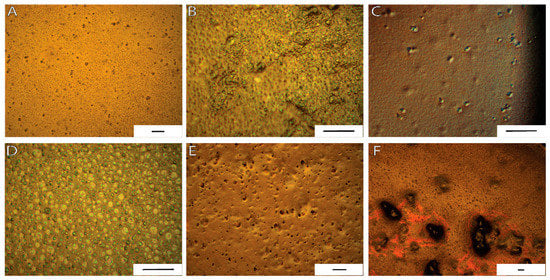 Polarized optical light micrographs of solvent casted polymer films: (A) AL-1; (B) AL-2; (C) AL-3; (D) AL-4, (E) LSL-1; and (F) LSL-2, revealed phase separation and aggregation of lignin within PAN-co-MA. [Scale bar = 50 microns].