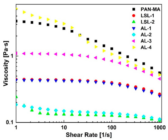 Previous studies suggested that the electrospinnability of polymer solutions, comprised of lignin, depends on the viscosity behavior of the polymer solution, which dictates the nanofibers’ morphological properties [41]. Furthermore, PAN-MA and 80/20 PAN-MA/lignin blend viscosity curves exhibited a Newtonian plateau from low shear rate up to at least 10 s−1 (LSL1, AL-1, AL-3; Figure 2). Note that larger lignin ratios (50/50) showed a slight increase in viscosities at low shear rates; however, this was probably due to the rheometer reaching the lower limit of torque and was not considered significant. Thus, all samples were safely within their zero-shear viscosity range under 1 s−1 with the exception of PAN-MA. The shear rate in the electrospinning needle, estimated according to laminar flow in a capillary (shear rate = 4 Q/p R3), was approaching 0.1 s−1; therefore, the flow behavior during electrospinning was considered to be Newtonian for all samples. Frequency sweep tests in oscillation mode confirmed the polymer solutions’ liquid-like behavior at different lignin concentrations and total polymer concentrations. At angular frequencies below 100 rad/s, G’’ > G’ for all the samples (Figure S3).