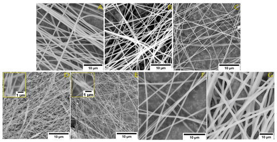 SEM images of electrospun PAN-MA/lignin nanofibers at a total polymer concentration of 10 wt % for (A) neat PAN-MA (control), (B) AL-1, (C) LSL-1, (D) AL-2, and (E) LSL-2; and at (F) 12 wt % AL-3, and (G) 20 wt % AL-4.