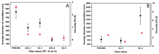 Correlations obtained between PAN-MA/lignin electrospun nanofibers’ diameter with polymer solution viscosity at 10 s−1 for (A) fibers of different lignin types and blend ratios at a total 10 wt % and (B) fibers at higher polymer content of 12 wt % (AL-3) and 20 wt % (AL-4). [Points with error bars represent nanofiber diameters].