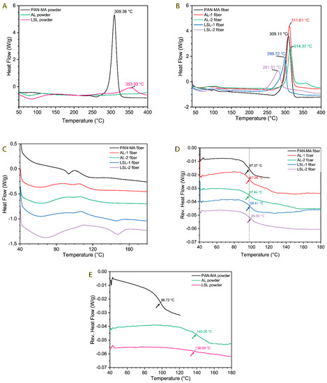 DSC results for the electrospun fibers are given in Figure 8C. The main decomposition peak of PAN-MA fiber is the same as the powder (309 °C). When PAN-MA was blended with increasing amounts of AL, this peak temperature increased, while PAN-MA blended with LSL resulted in a decreasing peak temperature. This trend is consistent with the TGA results given in Figure 6 and Figure 7. To more closely evaluate Tg results, the curves were enlarged and offset vertically to give Figure 8C. The irregularity of these curves made it impossible to determine the Tg of each material. Therefore, modulated DSC (mDSC) was conducted to help resolve these values, as given in Figure 8D. These results show that all the fibers exhibited a clear Tg around 97 °C. There was no apparent shift with the AL-containing fibers relative to pure PAN-MA, while the LSL containing fibers exhibited a 1 or 2 °C shift to higher temperatures (although this may be within the uncertainty of the measurement). Surprisingly, no indication of a glass transition was observed for the MA or LSL component of the blend, which was expected to occur around 140 °C based on the results of the pure powders (Figure 8E). The possible exception was for the AL-2 fiber (50% AL) in which it may be possible to interpret a broad step down between 110–160 °C. The Tg event for the PAN-MA powder and AL powder were of similar strength, while the LSL powder Tg was weaker and somewhat broader. The Tg results, while interesting, were not sufficient to allow us to make conclusions on the heterogeneity of the fibers.