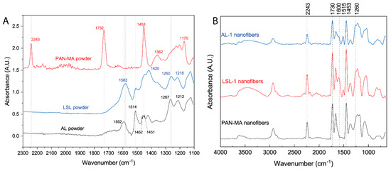 FTIR spectra of (A) LSL, AL, and PAN−MA (control) powders and (B) electrospun nanofibers of PAN−MA fibers (control), LSL−1 and AL−1. Both lignin samples had the same PAN−MA/lignin blend ratio (80/20) and were prepared at a 10 wt % concentration in DMF.
