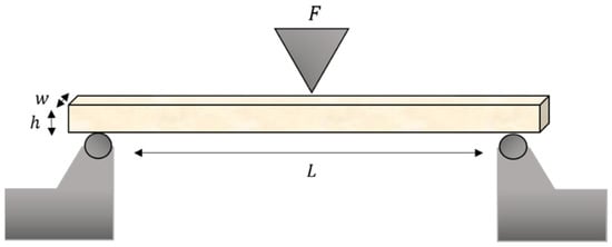where F is the load at a selected point of the elastic region of the stress–strain plot, L is the span length between the supports in millimeters, w is the width of the specimen in millimeters, h is the height of the specimen in millimeters, and d is the deflection of the specimen in millimeters (Figure 2).