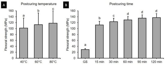 Results from two-way ANOVA. Flexural strength according to postcuring (A) temperature and (B) time. Data are mean and standard-deviation values of 3D printed specimens. Different lowercase letters indicate a significant difference.