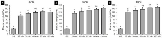 Results from one-way ANOVA. Flexural strength according to postcuring time for each postcuring temperature. (A) 40 °C (B) 60 °C and (C) 80 °C. Data are mean and standard-deviation values of 3D printed specimens. Different lowercase letters indicate a significant difference in the same group.