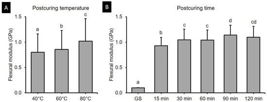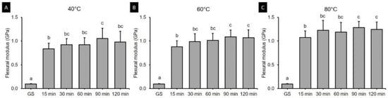Results from one-way ANOVA. Flexural modulus according to postcuring time for each postcuring temperature. (A) 40 °C (B) 60 °C and (C) 80 °C. Data are mean and standard-deviation values. Different lowercase letters indicate a significant difference in the same group.
