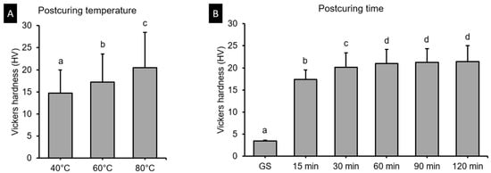 Results from two-way ANOVA. Vickers hardness data according to postcuring (A) temperature and (B) time. Data are mean and standard-deviation values. Different lowercase letters indicate a significant difference.