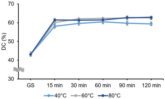 The results for the DC are shown in the Figure 9. The two-way ANOVA revealed that the postcuring temperature (F = 97.507, p < 0.001) and the postcuring time (F = 1856.26, p < 0.001) significantly affected the DC. There was also a significant interaction effect between curing temperature and time (F = 7.475, p < 0.001). The DC was significantly higher in the 60 °C (58.80 ± 7.22%) and 80 °C (58.76 ± 7.17%) groups than in the 40 °C group (56.70 ± 6.29%). Relative to GS specimens, the polymerization rate increased dramatically in the postcuring temperature, and was highest for 120 min at 60 °C (63.37 ± 0.42%) and lowest for 15 min at 40 °C (58.07 ± 1.28%) among the postcuring groups. However, after 60 min of postcuring, the polymerization rate did not vary significantly (p = 0.837) with the postcuring temperature.