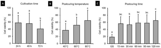 Results from three-way ANOVA. Cell viability data are presented according to (A) cultivation time, (B) postcuring temperature, and (C) postcuring time. Mean and standard-deviation values are shown. Different lowercase letters indicate a significant difference.