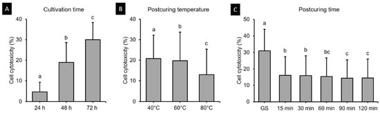 Results from three-way ANOVA. Cell cytotoxicity according to (A) cultivation time, (B) postcuring temperature, and (C) postcuring time. Mean and standard-deviation values are shown. Different lowercase letters indicate a significant difference.