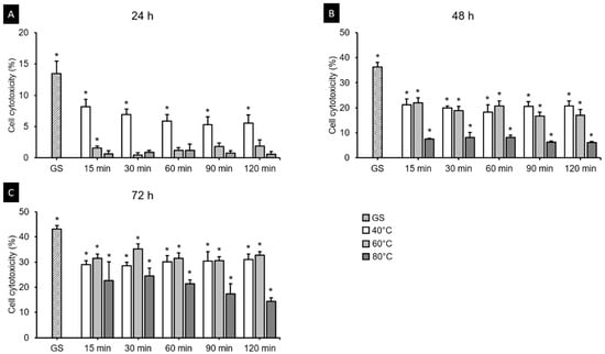 The HGFs were cultured on 3D printed specimens, and after 24, 48 and 72 h, cell viability assays demonstrated different results according to postcuring temperature and time (Figure 10). The three-way ANOVA revealed that cell viability differed significantly with the cultivation time (F = 36.204, p < 0.001), postcuring temperature (F = 79.775, p < 0.001), and postcuring time (F = 57.386, p < 0.001). There was a significant interaction effect between cultivation time, postcuring temperature, and postcuring time (F = 1.580, p < 0.05). Cell viability was lowest in the GS group, and increased continuously with the postcuring time (Figure 10C). After 24 h, the cell viability was highest for 120 min at 80 °C (89.51 ± 7.09%) and lowest for 15 min at 40 °C (48.53 ± 14.58%) (Figure 11A). At 48 and 72 h, the cell viability was higher in the 80 °C group (69.73 ± 33.96% and 55.58 ± 25.36%, respectively) than in the 40 and 60 °C groups (Figure 11B,C). According to t-tests, at 48 h of cell culturing, the cell viability did not differ significantly between the 80 °C group and the positive control (PC) (p > 0.05, Figure 11B), which refers to natural cell viability without a 3D printed specimen during the experiment.