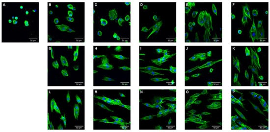 Confocal laser scanning microscopy (CLSM) images of human gingival fibroblasts cultures (5 × 104 cells/mL) on 3D printed specimens postcured at various temperature and times after 24 h of incubation: (A) GS, (B) 40 °C for 15 min, (C) 40 °C for 30 min, (D) 40 °C for 60 min, (E) 40 °C for 90 min, (F) 40 °C for 120 min, (G) 60 °C for 15 min, (H) 60 °C for 30 min, (I) 60 °C for 60 min, (J) 60 °C for 90 min, (K) 60 °C for 120 min, (L) 80 °C for 15 min, (M) 80 °C for 30 min, (N) 80 °C for 60 min, (O) 80 °C for 90 min, and (P) 80 °C for 120 min.