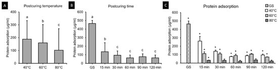 Results from protein adsorption assays. Mean and standard-deviation values are shown. (A) Two-way ANOVA showed that the protein adsorption decreased with postcuring temperature and (B) did not differ significantly after 30 min of postcuring time. Different lowercase letters indicate a significant difference. (C) The protein adsorption for 40, 60 and 80 °C groups. Asterisk indicates a significant difference from the PC in the t-tests.