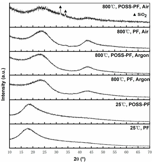 - The degradation processes of both phenolic resins are carbonization processes, and the solid phase in the residual products is mainly composed of char. In addition to the char, crystalline SiO2 is detected in the residue of POSS modified phenolic resin after degradation under air. The existence of SiO2 is mainly attributed to the reaction of POSS with oxygen at high temperatures, and the existence of SiO2 can effectively improve the high temperature oxidation resistance of phenolic resin.