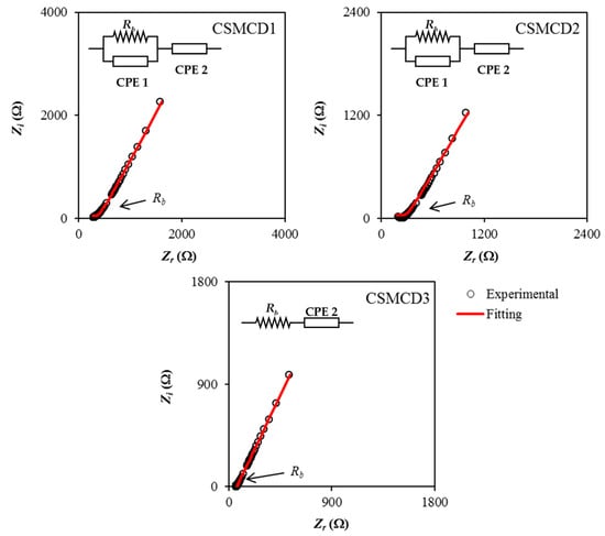 In Equation (6), C and ω represent the CPE capacitance and the angular frequency, respectively, while p is the deviation of the plot from the axis. The real impedance, Zr and imaginary impedance, Zi of the plots that consist of both spike and semicircle (CSMCD1 and CSMCD2) can be calculated using the equations below: