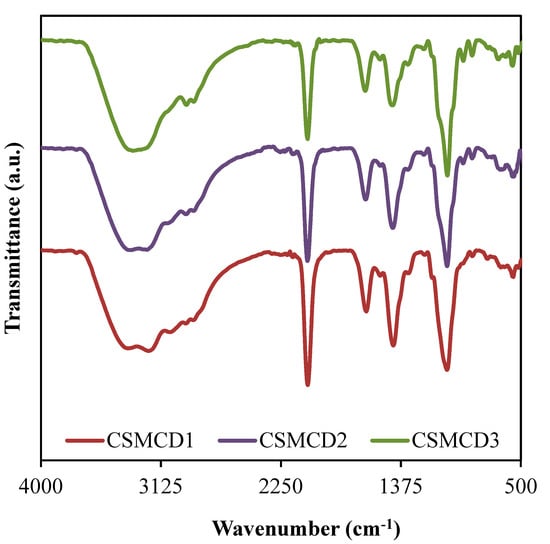 Furthermore, the peaks related to the C=O and C=C stretchings can be observed at 1640 and 1441 cm−1, respectively [,,]. These peaks are then shifted towards a higher WN when the concentration of glycerol is increased, which explains the interaction between glycerol and cations from the polymer–salt complex []. A comparable WN range for these bands was reported by Aziz et al. [] and Wang et al. []. Another obvious sharp peak credited to the C–O stretching is observed at 1044, 1043, and 1039 cm−1 for CSMCD1, CSMCD2, and CSMCD3 electrolytes, respectively. As this peak becomes sharper at a high concentration of glycerol, a small shoulder peak that is assigned to C-H2 rocking has appeared at 957, 961, and 968 cm−1 for CSMCD1, CSMCD2, and CSMCD3 electrolytes, respectively. This further proves the interaction between the CS–MC–NH4SCN and glycerol.