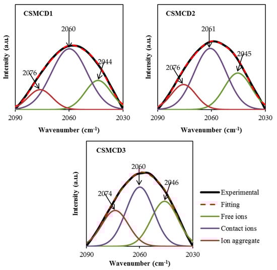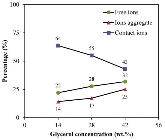 The free ions peak is observed at 2044–2046 cm−1, while the contact ions and ion aggregates peaks are located at 2060–2061 cm−1 and 2074–2076 cm−1, respectively. The percentage of ionic species is determined through the integral area fraction under the curve as summarized in Figure 4. It can be observed that increasing the glycerol concentration induces an increase in the free ions, whereas decreasing leads to a substantial reduction in contact ions. At 14 wt.% of glycerol, contact ions, free ions, and ion aggregates display a percentage of 64%, 22%, and 14%, respectively. As further glycerol was comprised, the integral percentage of free ions increased to (28%) and (32%) at (28 wt.%) and (42 wt.%), correspondingly. However, the integral percentage of ion aggregates was found to be slightly increased. Additionally, the association between different ionic species tends to be clear. Once the percentage of free ions reaches the highest value, the contact ion pairs demonstrate the lowest value. The reduction in contact ions is due to the increment of the concentration of free ions and ion aggregates in the electrolytes. The glycerol concentration is found to impact the percentage of ion species since the intensity of free ions peak becomes higher when the concentration of glycerol increases. This is highly harmonized with the ionic conductivity trend. The percentage of free ions for CSMCD3 is the highest of 32% with the minimum percentage of contact ions and ion aggregates. A comparable observation was reported by Noor and Isa [] and Brza et al. [].