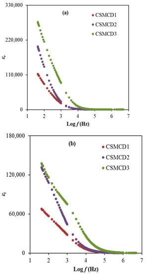 In condensed matter physics, the ion conduction process and dielectric properties in solids are two of the most studied subjects. In particular, dielectric properties in solid polymer-based electrolytes are an effective tool for obtaining knowledge about the electrical properties. The dielectric learning of each electrolyte is helpful for advancing the understanding of the conductivity performance as well as the polarization effects. The dielectric constant, ɛr is the amount of charges stored while the dielectric loss, ɛi is the energy loss during the movement of ions within the electrolytes. Furthermore, the dielectric constant plays a crucial role in demonstrating the dissolving potential of polymeric materials for a salt. Both dielectric parameters can be expressed by using Equations (11) and (12) and are depicted in Figure 5 [].