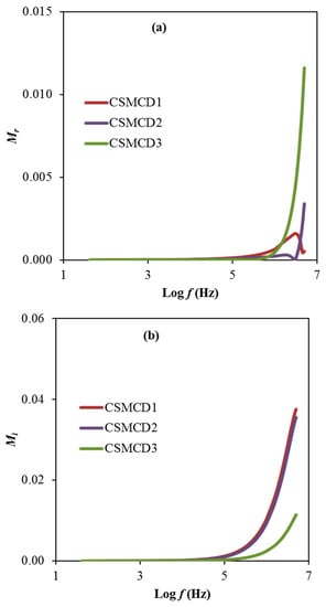 Based on electrical modulus plots in Figure 6, it is observed the presence of a dominant long tail at a lower frequency explained by the polarization effect of the electrodes that is consequently increased when the frequency increases []. However, the CSMCD1 and CSMCD2 electrolytes show a near plot of Mr which might be due to the slight difference of the transport parameters and also the ionic conductivity values. This observation pattern is also reported in the polymer electrolyte studies by Hadi et al. [] and Ponmani et al. []. For the reason of the sudden increase in the Mr and Mi values, the electrolytes in this work are classified as good ionic conductors []. Mr and Mi declined with limited tails at the low frequency region, denotation that the electrode polarization will make an insignificant contribution. The electrode polarization is linked to a higher capacitance value. The Mr and Mi spectra are in dissimilar manners in comparison with the prototype of εr and εi. At low-frequency regions, both εr and εi values are found to be higher (see Figure 5), whereas, the Mr and Mi values are decreased. Generally, the Mr and Mi in M* were created as a consequence of the opposition of εr and εi in ε*, as it is mathematically formulated in (M* = 1/ε*). The Mr and Mi point to the lowest values at the low frequency region which specify the material capacitive manner [,].