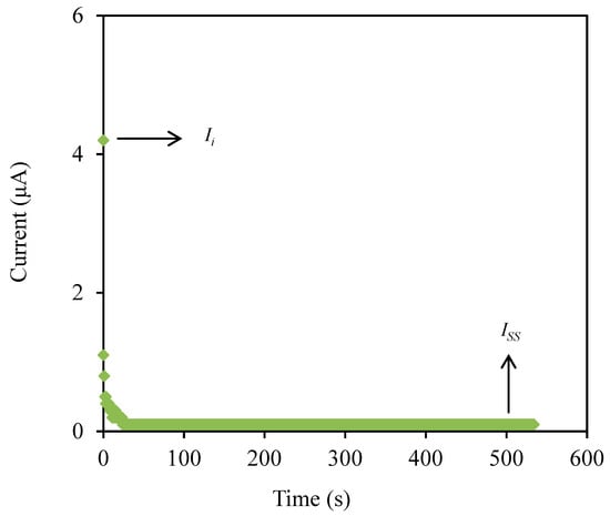 The CSMCD3 electrolyte exhibits a drastic drop of current in Figure 7 before it is optimized at a steady-state reading. The noteworthy fall is might be due to ions blockage at the electrode surfaces which consequently led to a constant current flow because the ions drifting is equivalent to the diffusion of the ion and causes the electrons to be the only species to pass through []. The current steady-state due to electron is obtained when ions are totally reduced in the system []. The transference numbers of the ion (tion) and electron (te) can be calculated using the following equations.