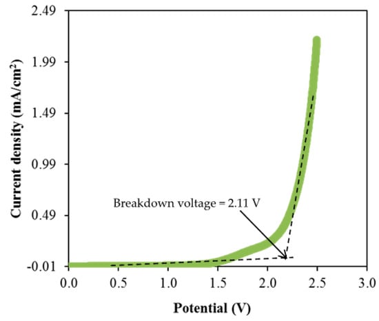 where Ii and Iss represent the current at initial and at steady state, respectively. The tion value obtained by CSMCD3 electrolyte is 0.976, while the calculated te value is 0.024. The ions will be the dominant charge species if the tion value is close to unity []. For the comparison, Shukur et al. [] reported a comparable tion value of 0.98 for the CS–NH4Br electrolyte system. The CMC–NH4SCN system by Noor and Isa [] also reported a high tion value of 0.93. In our previous work, the highest conducting electrolyte has been tested for TNM analysis and showed a high tion value []. Furthermore, the electrolyte’s maximum operating voltage can be obtained from the LSV study as plotted in Figure 8 [].
