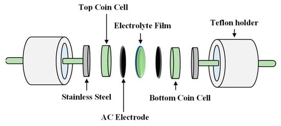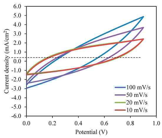 As observed in Figure 8, the current density value is unnoticeable until it reaches 2.11 V and no redox reaction is found to occur up to this point within the electrolyte []. Then, the current density is noticed to gradually increase from 2.11 V onwards which verifies the breakdown voltage of the electrolyte. The breakdown voltage for the glycerolized corn starch–LiOAc electrolyte system was reported at 2.10 V []. Brza et al. [] studied the PVA–NH4SCN–Cd(II) complex plasticized with glycerol and the breakdown voltage of the system was 2.10 V. The CSMCD3 electrolyte was found to be suitable for future applications since most of the energy devices required a minimum breakdown voltage of 1.0 V [,,]. Therefore, the performance of the CSMCD3 electrolyte is further evaluated in the fabrication EDLC using cyclic voltammetry (CV). Figure 9 depicts the CV curves of the CSMCD3 electrolyte at different scan rates. The schematic diagram of the EDLC cell can be depicted in Figure 10.