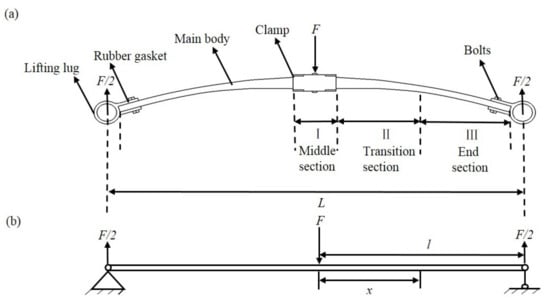 The composite leaf spring consists of main body, lifting lug, and clamp, while the body structure is made up of the middle section, two end sections, and the transition section between them, as shown in Figure 2a. The width of the middle and two end sections is the same, and the thickness within each of these sections is constant, while the transition section possesses variable width and variable thickness, and the cross-section area of all the sections is constant. In order to achieve the lightweight design, it requires that the used composite material is the least while ensuring the functionality and durability. The equal stress principle assumes that the ultimate stress of the shaft section of the designed leaf spring is the same, so the variation of mechanical properties of the composite is small. In the structural design of such leaf spring with variable width and variable thickness, several simplifications are adopted. Specifically, as the fiber in composite obtained from the winding forming process is basically oriented along the length direction, it is reasonable to assume that there is no variation in the composite mechanical property along the thickness and width directions. Hence, the leaf spring can be considered as transversely isotropic. Meanwhile, for the real structure of the leaf spring, it is a parabolic form, and the stiffness is considered as constant when it is deformed [29]. Therefore, the leaf spring is simplified as a cantilever beam, as shown in Figure 2. When the leaf spring is under loading, the middle section is subject to applied load F, and the fixed part at both ends are subject to supporting force F/2, as shown in Figure 2a. Comparatively, for the cantilever beam, the loading scheme is consistent with that of the leaf spring, as shown in Figure 2b. Due to the symmetric structure of the composite leaf spring, half of the cantilever beam model is selected for the calculation, with a length, l.