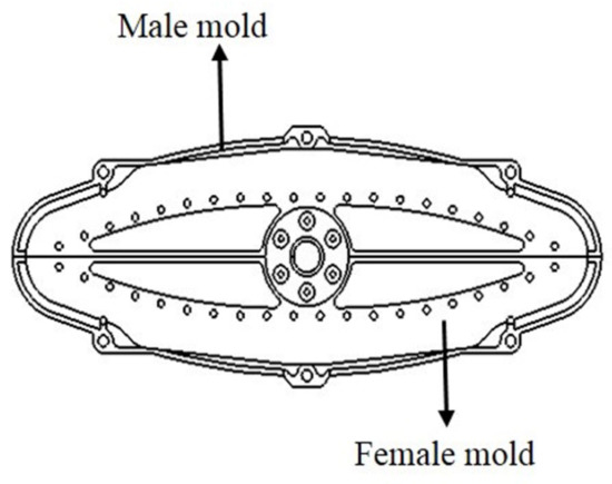 Based on the design parameters, the GFRP composite leaf spring was prepared and measured using the three-point bending test. In this work, the glass fiber is used in manufacturing the FRP composite instead of carbon fiber as its cost is comparatively lower. Meanwhile, the mechanical performance of GFRP meets the requirements of composite material in the automobile industry, and the GFRP is widely used for composite structure in actual engineering applications [42]. Therefore, the glass fiber is considered in this work. E-glass fiber/epoxy composite material with 40% volume fraction of fiber was taken to manufacture the composite leaf spring samples. The E-glass fiber was chosen as the reinforcement material. The tensile strength and modulus of E-glass fiber are 2.482 and 82 GPa, as provided by the supplier Taishan Glass Fiber Company. The epoxy used here was composed of two parts, including epoxy resin and anhydride-modified curing agent, which was supplied by Tianjin Dasen Company. The GFRP composite leaf spring was manufactured using the filament winding process, as it effectively reduces the processing cost of composites [43,44,45,46]. Specifically, the winding mold of the composite leaf spring includes two parts, i.e., the male mold and the female mold, as shown in Figure 4. The winding mold is a symmetrical geometric structure with variable thickness and variable width. Two leaf springs can be obtained by the winding process. The winding parameters are set during the winding process control, mainly including the winding tension and winding speed. The number of winding layers of the composite leaf spring was determined first, which was obtained by dividing the maximum thickness of the composite leaf spring of 37.1 mm (Table 2) by the thickness of a single composite layer of 3.3 mm obtained by measuring the sample before the winding process. Accordingly, the total number of winding layers in this work was determined as eleven. During the manufacturing process, the polymer matrix was firstly prepared, where the epoxy resin and curing agent were mixed with the mass ratio of 100:84.5 and stirred evenly, which were then kept at a constant temperature of 50 °C for 1 h for the sufficient cross-linking reaction between epoxy resin and curing agent. After that, the winding process of the composite leaf spring was carried out. The winding parameters are set during the winding process control, mainly including the winding tension and winding speed. Specifically, the winding tension is required to decrease every few layers, so as to reduce the pressure of the outer layer on the inner layer and to avoid the fiber buckling. Meanwhile, the winding speed was controlled according to the rotation rate of the core mold of the winding mold. It was determined that with the decreasing tension from 60, 40, to 20 N, and the winding speed of 3 r·min−1, the manufactured composite leaf spring possessed the higher fiber volume fraction of 65.7% compared with the other two cases of 70, 50, to 30 N, and 50, 30, to 10 N. Therefore, the winding tension decreasing from 60, 40, to 20 N and the winding tension speed of 3 r·min−1 were selected in this work. During the winding process, four layers of fiber after immersing in the glue were wound around the whole winding mold layer-by-layer under tension of 60 N, another four layers were wound under 40 N, and a final three layers were wound around under 20 N. After the filament winding process, the sample was cured at the temperature level of 85 °C for 0.5 h, 95 °C for 1 h, 105 °C for 0.5 h, and 120 °C for 1 h, respectively. Subsequently, it was naturally cooled down to room temperature for pressure relief and demolding. Three glass fiber-reinforced polymer (GFRP) composite leaf spring samples were prepared. The overall dimensions of the spring samples were 1388 × 90 × 37 mm, as adopted from the design results listed in Table 2. The technological parameters of the filament winding process are summarized in Table 3. After the above winding parameters are set, the winding machine is started, and the leaf spring is wound according to the set winding process. Through the winding process control system, the fibers are aligned along the beam axis.