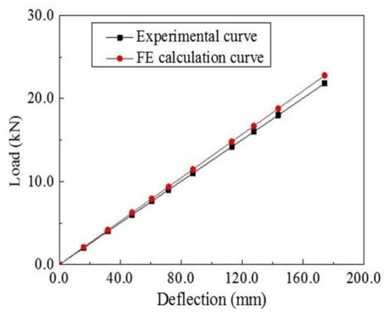 The load-deflection curve obtained from FE simulation is shown in Figure 6. The FE result is very close to the experimental curve, which indicates the agreement with the experiment. The deflection distribution diagram of the FE composite leaf spring model under the three-point bending test is shown in Figure 7. The maximum deflection is wmax = 166.8 mm, and the maximum force, Fmax, is 21,800 N according to Section 3.2, so the bending stiffness is k = Fmax/wmax = 21,800/166.8 N·mm−1 = 130.7 N·mm−1, which is close to the experimental result with a value of 125.3 N·mm−1, as presented previously. It is observed that both experimental and FE results meet the bending stiffness design requirement of 124 ± 12 N·mm−1 (see Table 1).