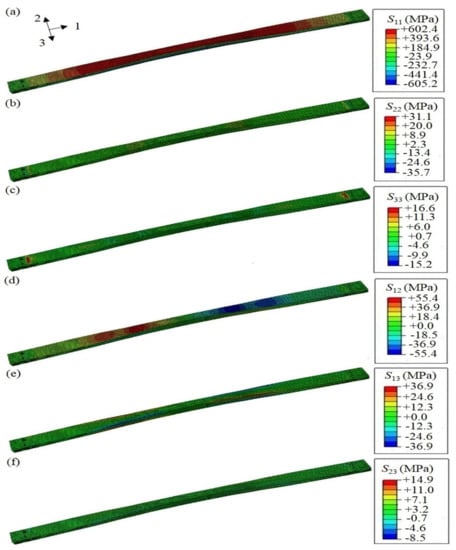 Apart from the full loading condition, the stress distribution of the composite leaf spring under limit loading condition is calculated, as shown in Figure 9. Specifically, the distribution of normal stress along length direction S11 is shown in Figure 9a, which is in the range between −605.2 to +602.4 MPa. The absolute values of these two strengths are very close. In Table 4, the tensile strength value after considering the safety coefficient is 1000 MPa. As 605.2 MPa is smaller than 1000 MPa, it meets the material strength requirement. Similarly, 602.4 MPa is smaller than the compressive strength value after considering a safety coefficient with a value of 673.1 MPa, which meets the material strength requirement. Both 605.2 and 602.4 MPa are much larger than the maximum stress 462.2 MPa of a composite leaf spring obtained from the optimal design by GA [22]. Meanwhile, the simulation results of 605.2 and 602.4 MPa are also much larger than the tensile strength, 450 MPa, of a steel leaf spring [51], which demonstrates that the composite leaf spring designed by the MATLAB algorithm here has better strength performance along length direction under limit loading condition. Meanwhile, the distribution of normal stress along thickness direction, S22, and along width direction, S33, is shown in Figure 9b,c, which is in the range of −35.7 to +31.1 MPa and −15.2 to +16.6 MPa, respectively. In Table 5, the tensile strength value after considering the safety coefficient is 34.6 MPa, which is higher than the values of S22 and S33. Furthermore, the distribution of shear stress along length-thickness direction S12, length-width direction S13, and thickness-width direction S23, is shown in Figure 9d–f, respectively. Additionally, the longitudinal-transverse shear strength, στ±45°, has a value of 36.9 MPa, and the interlaminar shear strength, σILSS, has a value of 57.0 MPa. As the calculated stress along each direction is smaller than the requirement of material strength, the calculation results are reasonable.