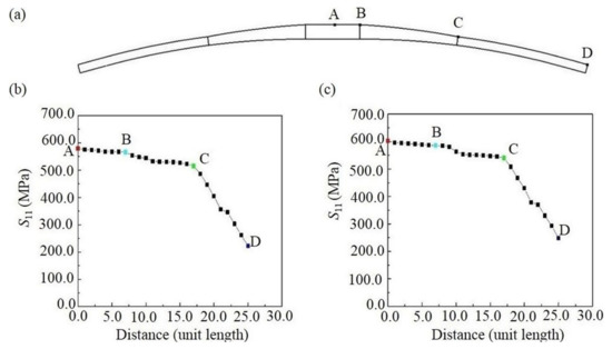 From previous discussion, it is learned that under two loading conditions, the composite leaf spring is mainly subject to normal stress along length direction S11. The node with the maximum stress is located in the center of the leaf spring, as shown as point A in Figure 10a. This node is defined as the coordinate origin along the length direction, and the distance between two adjacent nodes along the length direction is regarded as d*. A series of nodes along the length direction of the composite leaf spring are selected successively. Notably, point B and C as shown in Figure 10a refer to the start of the variable width section and constant width section, respectively. The normal stress, S11, of different nodes under full loading and limit loading conditions is shown in Figure 10b,c, respectively. It is observed that the tensile stress of the composite leaf spring decreases steadily along the length direction. Specifically, the decreasing rate of S11 along the variable width section BC is close to that of the middle section AB, and the decreasing rate along constant width section CD is the largest. The reason is that the slope affects stress transfer, where the greater the slope, the greater the stress changing. As the slope of the CD section is the largest, it possesses the largest decreasing rate of S11. Furthermore, as the value of limit load is larger than the full load, the stress value of the same node in Figure 10c is higher than that of Figure 10b.