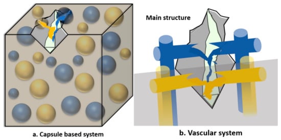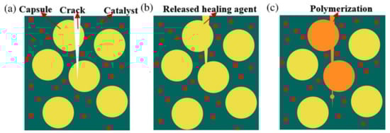 Self-healing is described as a method which has the ability to perceive any unfunctional device or system without human intervention and make the necessary adjustments to restore itself back to its normal condition. The self-healing method is expected to detect and repair the microcracking in products or system that help to recover the mechanical or functional performance of the material. It represents the next generation of technology, which helps to greatly improve important performance of products, as it has been built in into various applications for structural, electronic, medical and aerospace products [13,14,15,16]. This approach is very significant in situations where repairing or inspection is difficult, hazardous, and costly [17].