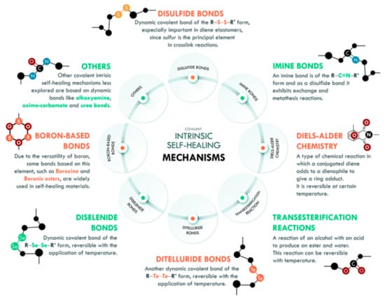 The formation of chemical bonds between different molecules or functional groups of a polymer can be described by the reversibility of the covalent bond, where the opening and closing of the bonding sites results in an equilibrium which serves as the basis for the self-healing process [27]. Besides that, external conditions such as temperature, pressure or electrical stimuli can affect the chemical bonds. Generally, this mechanism can be accomplished with a high or low temperature. However, changes in the pH value, irradiation, moisture, or catalytic activity also can affect the disconnection and reconnection of the active sites [27]. The reversibility of the cross-links in the polymers provides a wide range of possible binding concepts with regards to the polymer structure itself. The network formation is held either in the main chain, side chain, or with a multifunctional linker, for example disulfide bonds, Diels–Alder chemistry, imine bonds, di-selenide bonds, boron-based bonds, transesterification reactions, ditelluride bonds, and others (see Figure 3).