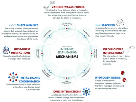 Compared to the extrinsic mechanism, the intrinsic self-healing mechanism does not need an external agent to repair the damage [3]. This process allows for multiple and repeatable self-repair after numerous of damage or healing [26]. Besides that, intrinsic self-healing polymer materials have various advantages like (i) fast self-healing of functions due to the absence of diffusion and polymerization control steps and (ii) adaption in restoring low-volume defects/cracks because of their sensitive reversible dynamic bonds in molecular scale [26]. Intrinsic self-healing can be achieved through the inherent reversibility of molecular interactions of the matrix polymer, which evades complex problems such as the integration and compatibility of healing agents. Materials with intrinsic healing properties are triggered by external stimuli, such as electrical or photo stimuli, heat or pressure, or the reaction of substances when introduced together, to prompt them to heal. For intrinsic self-healing, molecular mechanisms can occur from physical interactions and/or chemical interactions. The healing process is achieved by tailoring dynamic bond interactions from the molecular level or formulating interplay between the diffusion and entanglement of polymer chains [26]. Chemical bond interaction-based self-healing can be further classified into covalent and non-covalent bond interactions.