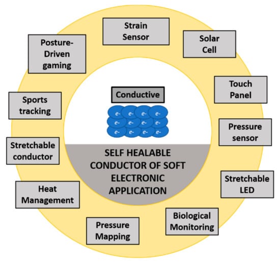 Therefore, monitoring and repairing microcracking inside the device becomes difficult and almost impossible. Self-healing is a potential approach to overcome this problem. It has proven to be successful when it comes to integration into functional electronic devices including sensors, supercapacitors, perovskite solar cells, field-effect transistors (FETs), and batteries [34]. In advanced technologies, self-healing methods can also be applied in wearable electronics and artificial skin-like materials [35]. In electronic applications, there are only few numbers of self-healing polymeric systems that have been used because of the numerous requirements of such applications (including combining mechanical and electrical properties, electrical and environmental stability, and scalability) as well as a lack of understanding of the necessary design rules [32].