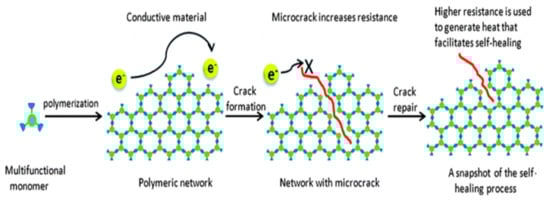 Fundamentals of electrically conductive self-healing materials. Electrical resistance increases upon formation of a microcrack, as the total number of electron percolation pathways decreases. As the microcrack is the source of the resistance increase, the generation of heat is localized at the fracture point according to the authors of [37].