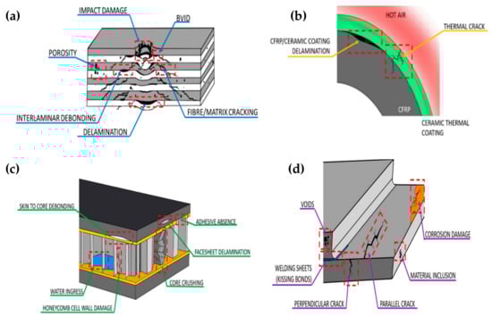 Common composite material use in spacecrafts are materials made of a polymer matrix reinforced with fiber, such as fiber-reinforced plastics (FRPs) reinforced with glass fibers (GFRPs), FRPs reinforced with carbon fiber polymers, and carbon-epoxy fiber-reinforced plastic (CFRP) polymer composites such as thermosetting epoxy reinforced with high-performance fibers [55]. Others matrix composites used in this application are ceramic matrix composites (CMCs), metal matrix composites (MMCs) and E-glass-epoxy composites (EGCs) [14]. However, composite material also endures deterioration due to impact load. The impact damage, which starts at the microscopic level from the formation of microscopic void, then is generated into a deep microcracking and delamination in structure, which reduces the structural integrity and leads to premature failure, as illustrated in Figure 8a–d [6].