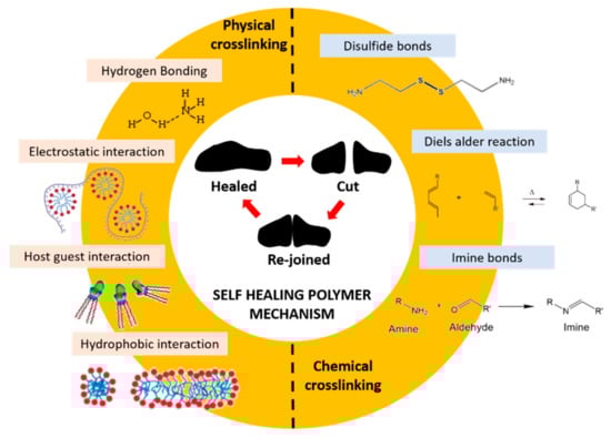 The self-healing mechanism of hydrogels can be divided into two general methods, which are physically cross-linking (non-covalent interactions) and chemical cross-linking (reversible covalent interaction), as illustrated in Figure 10 [72,73]. Physically cross-linking mainly applies to hydrogen bonds, electrostatic interactions, hydrophobic interactions, and host–guest interactions. On the other hand, chemical cross-linking is mainly applied to Schiff base or imine bonds, Diels–Alder reactions, and disulfide bonds to form an insoluble network. The stability and mechanical properties of the self-healing hydrogels depends on the type and strength of the linkages that are used during the hydrogel synthesis. Therefore, it is important to better understand the self-healing mechanism as it can affect in the mechanical properties and design of hydrogels for biomedical applications, allowing materials to self-heal damages intrinsically and automatically. In this section, we focus on the type of mechanism that exists in designing the self-healing hydrogels.