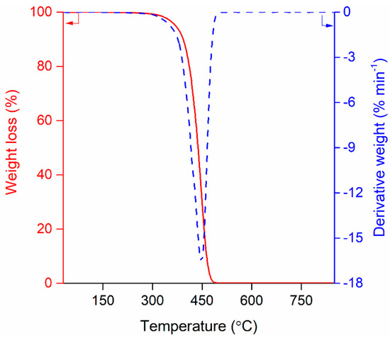 Thermogravimetric analysis (TGA) and derivative weight profiles of the low-density polyethylene (LDPE) sample used as the feedstock in this study.