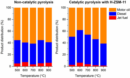In the pyrolytic liquid produced via the non-catalytic pyrolysis of LDPE, hydrocarbons in the range of C10–C44 were identified and quantified; however, C8–C35 hydrocarbons were identified in the pyrolytic liquid produced via the catalytic pyrolysis in the presence of the H-ZSM-11, as summarized in Table 2. This shows that the H-ZSM-11 catalyst may have an effect on cracking high-molecular-weight hydrocarbons. The hydrocarbons made by the pyrolysis of LDPE could be categorized according to their carbon numbers as jet fuel-range hydrocarbons (C5–C14), diesel-range hydrocarbons (C8–C21), and motor oil-range hydrocarbons (C18–C35) [34]. Figure 4 presents distributions of fuel-range hydrocarbons in the pyrolytic liquid produced via the pyrolysis of LDPE without and with the H-ZSM-11 catalyst at different pyrolysis temperatures. For the non-catalytic pyrolysis, the product distributions were not noticeably changed by varying the pyrolysis temperature. However, the distribution of pyrolytic liquid made via the catalytic pyrolysis was more susceptible to temperature. For instance, the content of diesel decreased from 55.5% to 37.5% as the temperature increased from 600 °C to 900 °C, while the content of motor oil increased from 38.1% to 61.1%.