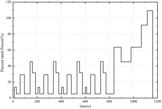 In the fuel cell stack, deionized water is used as cooling water and composite material is used as bipolar plate. The operating conditions used in the fuel cell stack durability test are derived from the NEDC (New European Driving Cycle). In this paper, according to the characteristics of NEDC operating conditions and the actual vehicle driving conditions, the cycle condition of the vehicle fuel cell stack durability platform test is established, including idle speed, acceleration, deceleration, constant speed, the rated working conditions and other daily vehicle employment conditions [8]. The test working condition is shown in Figure 2.