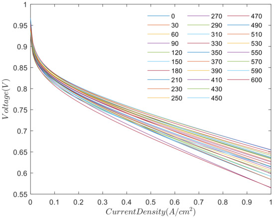 In the characterization technology of a fuel cell, the current-voltage response of the fuel cell, i.e. the polarization curve, reflects the overall performance of the fuel cell. In this paper, the cycle durability test of fuel cell stack has been carried out for 600 h, and 1800 cycles have been completed. In the first 630 cycles (0–210 h) of fuel cell operation, the polarization curve test is carried out per 90 cycles. After 630 cycles (210–600 h), the polarization curve test is carried out per 60 cycles. Therefore, 28 polarization curves are obtained.