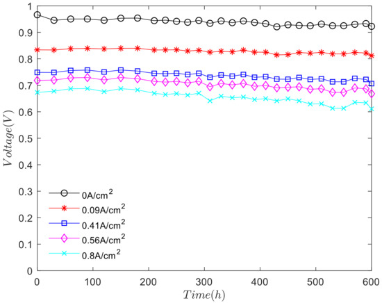 When the fuel cell stack is in the open circuit state, the current density is 0, the voltage attenuation is different from other current density. The attenuation of open circuit voltage over test time is shown in Figure 6.
