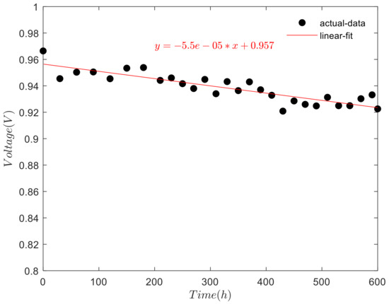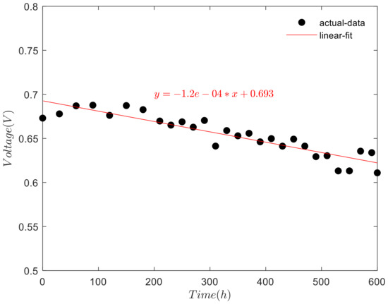 Within 180–600 h, the voltage decreases over time are in fluctuation, the voltage downward trend can be linear fitted, and the fitting line slope is the voltage attenuation rate. The voltage attenuation rates are shown in Figure 9.