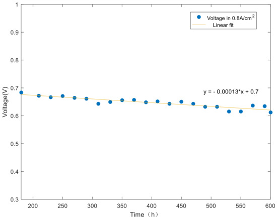 As shown in Figure 6, the open-voltage of the fuel cell stack s with the increase of the test time. The linear fitting of the open-circuit voltage shows a downward trend with the increase of test time. When the test is carried out to 600 h, under the open-circuit condition, the voltage of fuel cell stack decreased 43.8 mV. The voltage attenuation rate is 55 μV/h, with an attenuation amplitude of 4.5%.