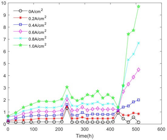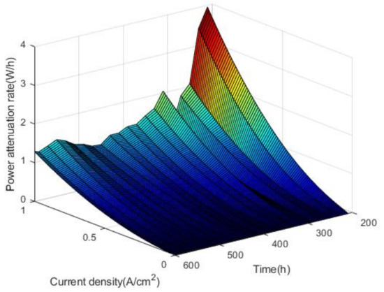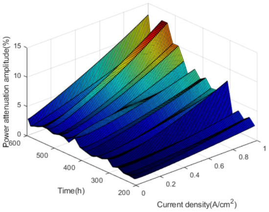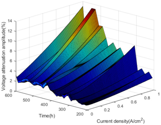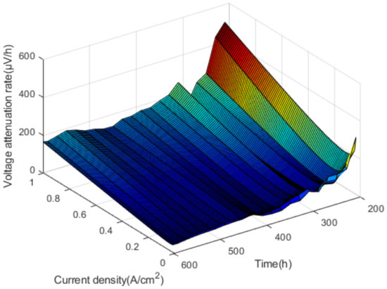 In the nonactivation period, by calculating the voltage attenuation amplitude at any time within 180–600 h, the voltage attenuation amplitude corresponding to different time and current density is obtained. The voltage attenuation amplitudes are shown in Figure 10.