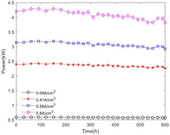According to the polarization curve fitting of the fuel cell stack, the voltage and current of the fuel cell stack under different cycles were obtained, and then the power of the fuel cell stack was calculated. Power can reflect the output capacity of the fuel cell stack, the power output at the commonly used current density is shown in Figure 11.