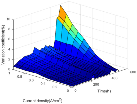 As shown in Figure 14, it can be discovered that the coefficient of variation increases with the increase of current density in 180, 210, 250, 290, 330, 370, 410, 450, 530, 600 h, that is, the uniformity of fuel cell stack is worse with the increase of current density. The results show that the voltage uniformity of fuel cell stack becomes very poor under high current density. Figure 15 shows the overall variation coefficient of the fuel cell stack cell with time and current density.