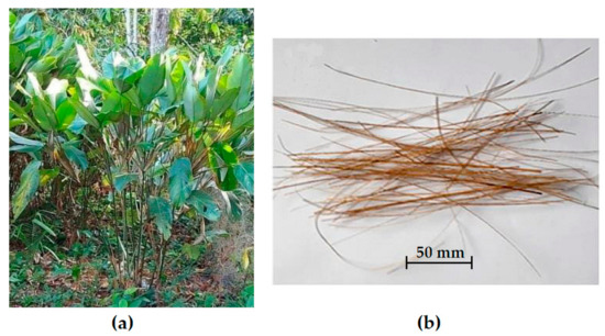 Guaruman: (a) plant and (b) fibers extracted from splinted stem (adapted from Reis et al. [35]).